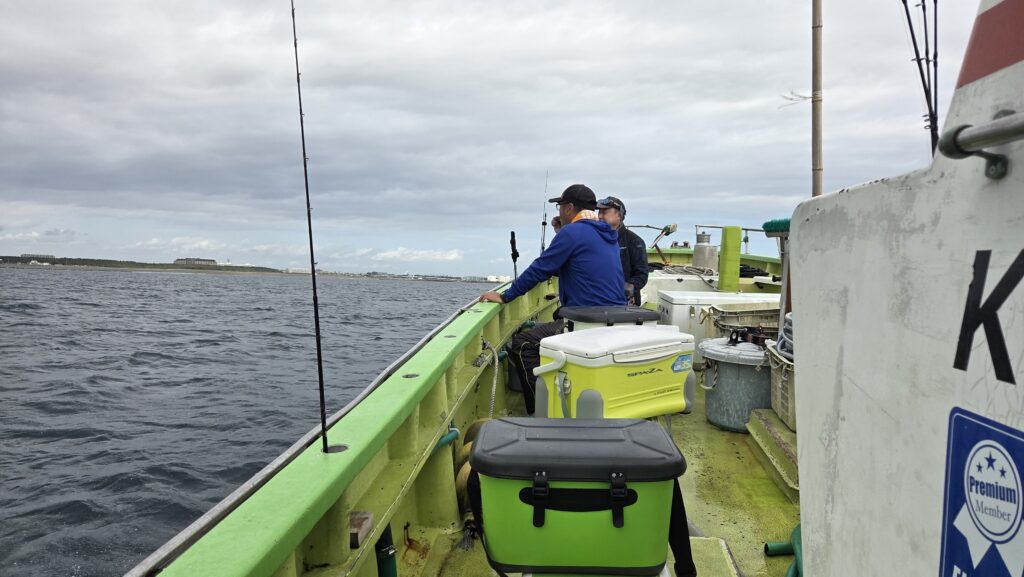 左舷舳に根掛かり君、番長、皇帝、俺、左に大漁君の布陣で臨む!