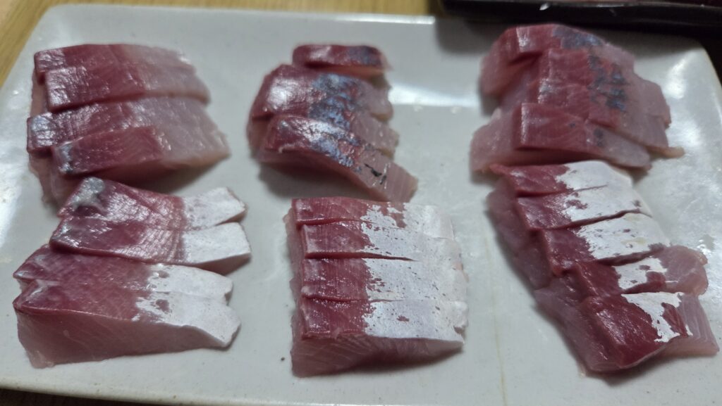 アジとイナダも三枚に卸し、今日食べる分だけ刺身で頂いた。