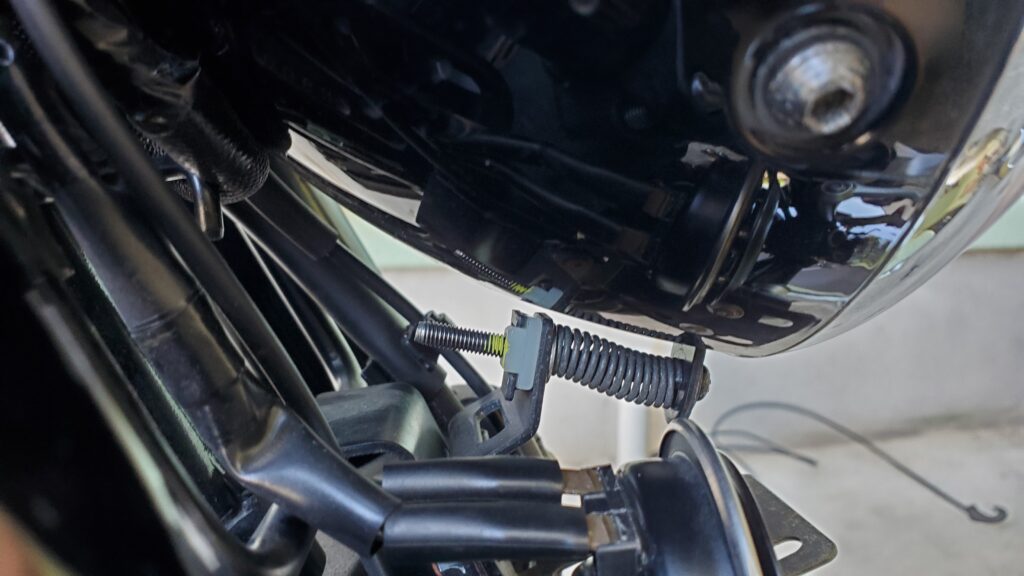 ライトケースの六角2本とビス4本と高さ調整用の光軸ボルトバネ、白いナットを外して、コネクターを抜くとヘッドライトは外せます。